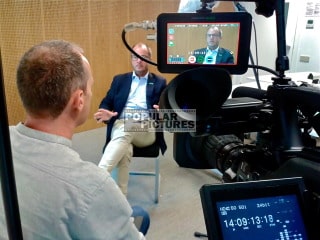 English-speaking, lighting cameraman with Sony PDW700 XDCAM, sound and lighting, filming corporate interviews at Hewlett Packard Headquarter (Sant Cugat del Vallés) Barcelona, Spain.