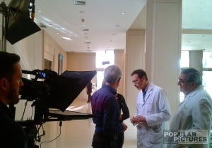 Bilingual teleprompter operator with complete 17″ teleprompter equipment for corporate interviews at Teknon hospital, Barcelona, Spain.