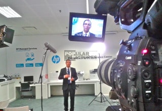 Lichtsetzender Kameramann mit Canon EOS C300, Ton und Licht für Corporate Interviews im Hewlett Packard Headquarter, Barcelona, Spanien.