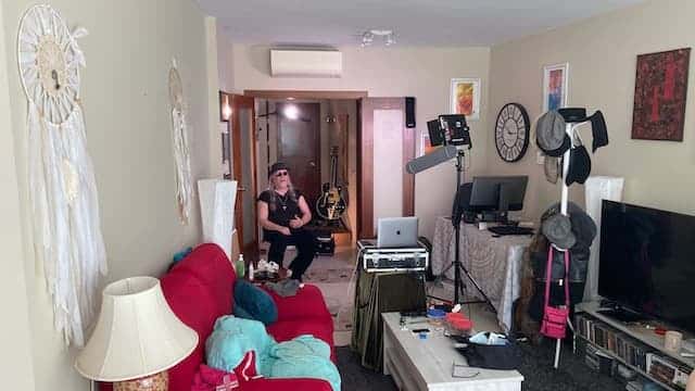 Lichtsetzender Kameramann in Altea, Spanien für eingeleuchtete Interviews mit Alice Cooper’s Gitarrist Steve Hunter für Channel 5 TV-Dokumentarfilm “The story of the songs” (Channel 5 / Viacom CBS networks international). Mit unserem mobilen live streaming kit können Producer in London Interviews in Spanien führen als wären sie selbst vor Ort.
