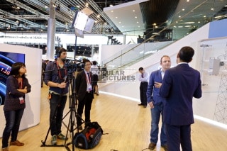 Lichtsetzender Kameramann mit Sony PDW700 Kamera Equipment, Studio-Interview-Licht und Audio Equipment für CNBC Multi-Kamera Live Produktion und Live-Berichtserstattung vom Mobile World Congress in Barcelona, Spain.