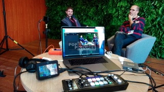 Zweisprachiges EB-Team, Bildmischer und Cutter für HUAWEI Corporate Interviews auf dem Mobile World Congress in Barcelona, Spanien. Multi-Kamera-Produktion mit 2x Canon EOS C100, Licht und Ton während der GSMA Mobilfunk-Weltausstellung 2017.