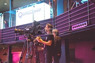 Lighting cameraman with Sony PDW700 camera equipment, Studio Lighting kit and audio equipment for CNBC multi-camera live production and news coverage from the Mobile World Congress in Barcelona, Spain.