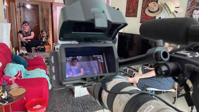 Lighting cameraman in Altea, Spain shooting lit interviews for Channel 5 TV documentary “The story of the songs” (Channel 5 / Viacom CBS networks international) covering Alice Cooper’s guitarist Steve Hunter in Altea, Spain. Due to our portable live streaming setup, the producer in London is able to remotely conduct the interviews in Spain with no compromise on quality, as if he were on-site.