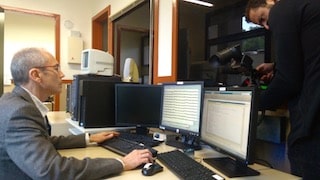 videographer films scientist in Barcelona for CNBC program Camera operator is filming cameraman filming scientist in Barcelona for CNBC science program