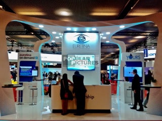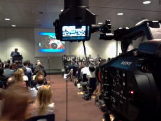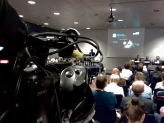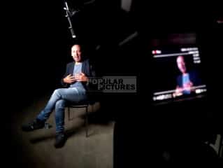 Bilingual videographer with Sony PXW-FS7 camera, slider, audio and lighting equipment for corporate interviews and video shoot at Roche Pharmaceuticals in Madrid, Spain.