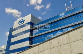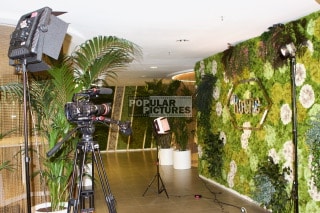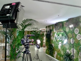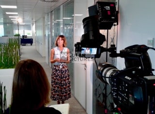 Bilingual videographer with Sony PXW-FS7 camera, slider, audio and lighting equipment for corporate interviews and video shoot at Roche Pharmaceuticals in Madrid, Spain.