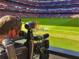 English-speaking camera-crew with Sony PDW-700 XDCAM, sound and lighting for German broadcaster Sat.1 «ran», shooting Corazon Classic Match 2016: Real Madrid vs. Ajax Amsterdam legends at Santiago Bernabeu in Madrid, Spain.
